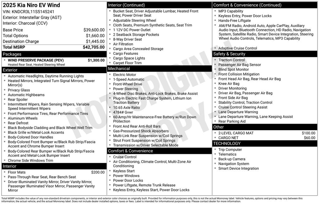 Interstellar Gray 2025 Kia Niro EV Wind 4D Sport Utility FWD 1-Speed Automatic Electric Motor 126/101 City/Highway MPG Price includes: $1000 - Sticker Sales Event Retail Bonus Cash. Exp. 01/02/2026 $10000 - Kia Customer Cash. Exp. 01/02/2026 $500 - Military Program. Exp. 01/02/2026