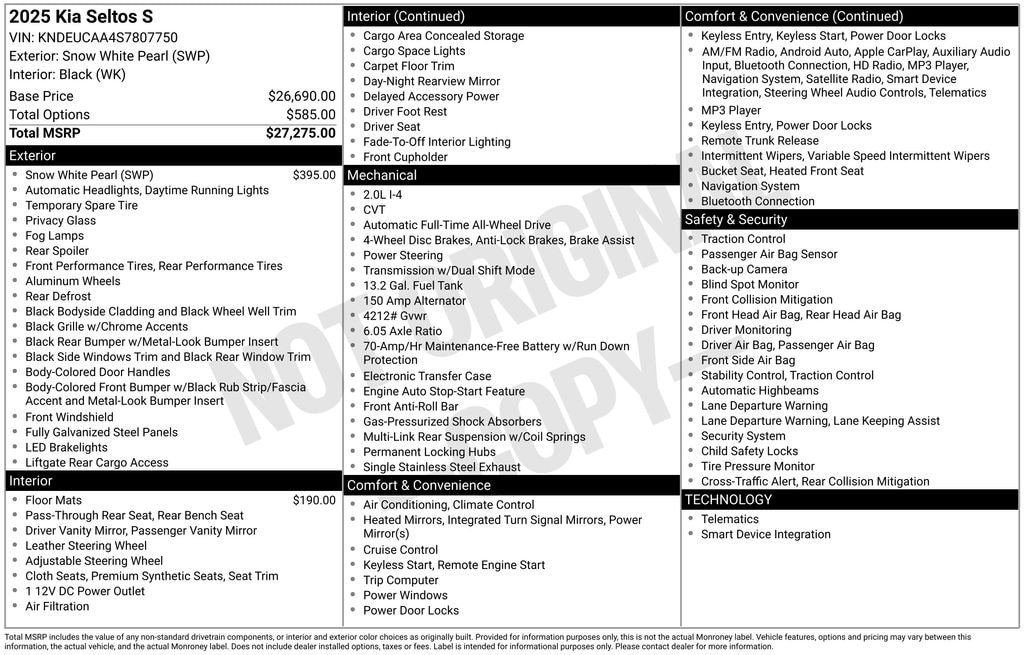 Snow White Pearl 2025 Kia Seltos S 4D Sport Utility AWD CVT 2.0L I4 MPI 27/31 City/Highway MPG Price includes: $1000 - KFA Dealer Choice Program: $1000 discount and 5.50% APR for 36 months. $30.20 per $1000 financed. Available to well qualified buyers who finance through Kia Finance America. 506. Exp. 11/03/2025 $500 - Military Program. Exp. 11/03/2025 This rebate is only available if you also take the 'KFA Dealer Choice Program: $1000 discount and 5.50% APR for 36 months' rebate. $500 - APR Bonus Cash. Exp. 11/03/2025