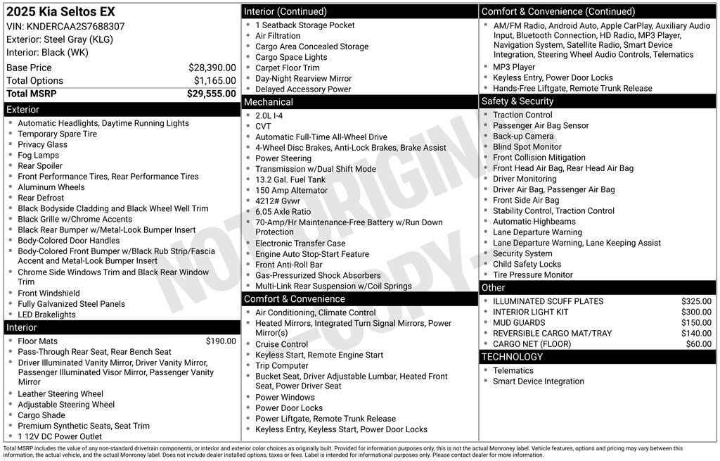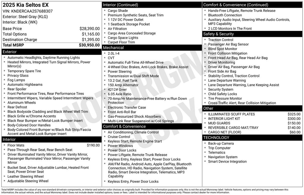 Steel Gray 2025 Kia Seltos EX 4D Sport Utility AWD CVT 2.0L I4 MPI 27/31 City/Highway MPG