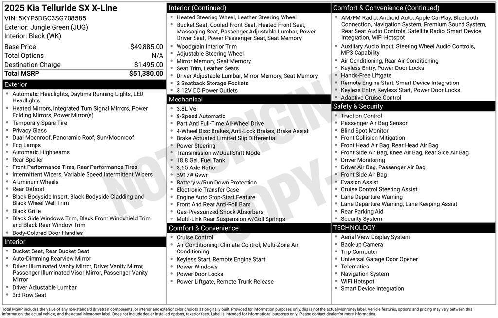 Jungle Green 2025 Kia Telluride SX X-Line 4D Sport Utility AWD 8-Speed Automatic 3.8L V6 DOHC Price includes: $1000 - Sticker Sales Event Retail Bonus Cash. Exp. 01/02/2026 $2000 - KFA Dealer Choice Program: $2000 discount and 5.25% APR for 36 months. $30.08 per $1000 financed. Available to well qualified buyers who finance through Kia Finance America. 506. Exp. 01/02/2026 $500 - Military Program. Exp. 01/02/2026