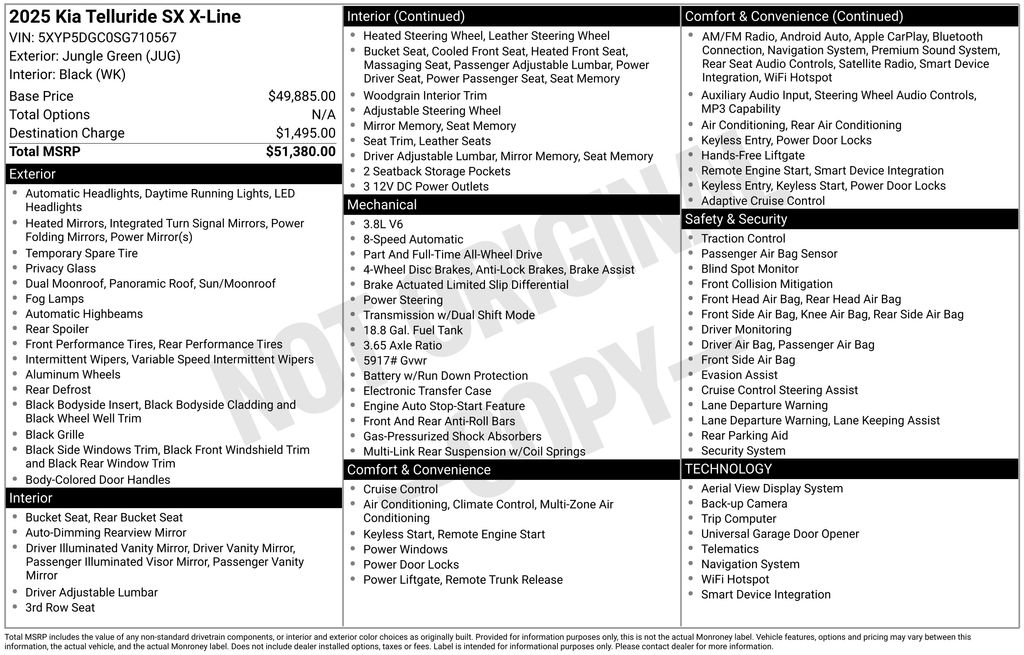 Jungle Green 2025 Kia Telluride SX X-Line 4D Sport Utility AWD 8-Speed Automatic 3.8L V6 DOHC Price includes: $2000 - Kia Customer Cash. Exp. 02/02/2026