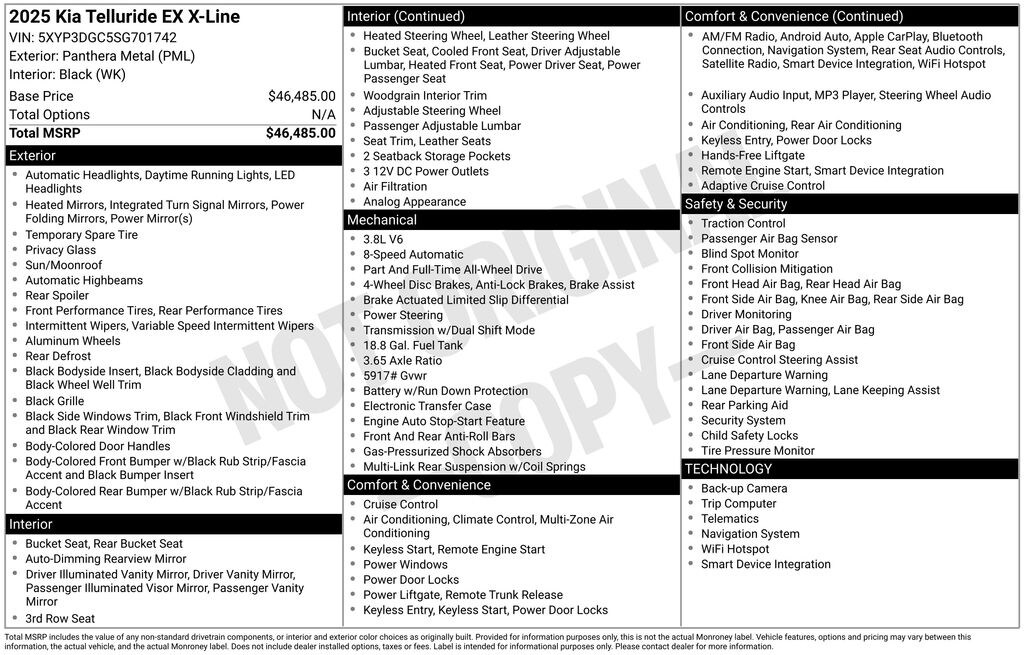Panthera Metal 2025 Kia Telluride EX X-Line 4D Sport Utility AWD 8-Speed Automatic 3.8L V6 DOHC Price includes: $1500 - KFA Dealer Choice Program: $1500 discount and 5.50% APR for 36 months. $30.20 per $1000 financed. Available to well qualified buyers who finance through Kia Finance America. 506. Exp. 11/03/2025 $500 - Military Program. Exp. 11/03/2025