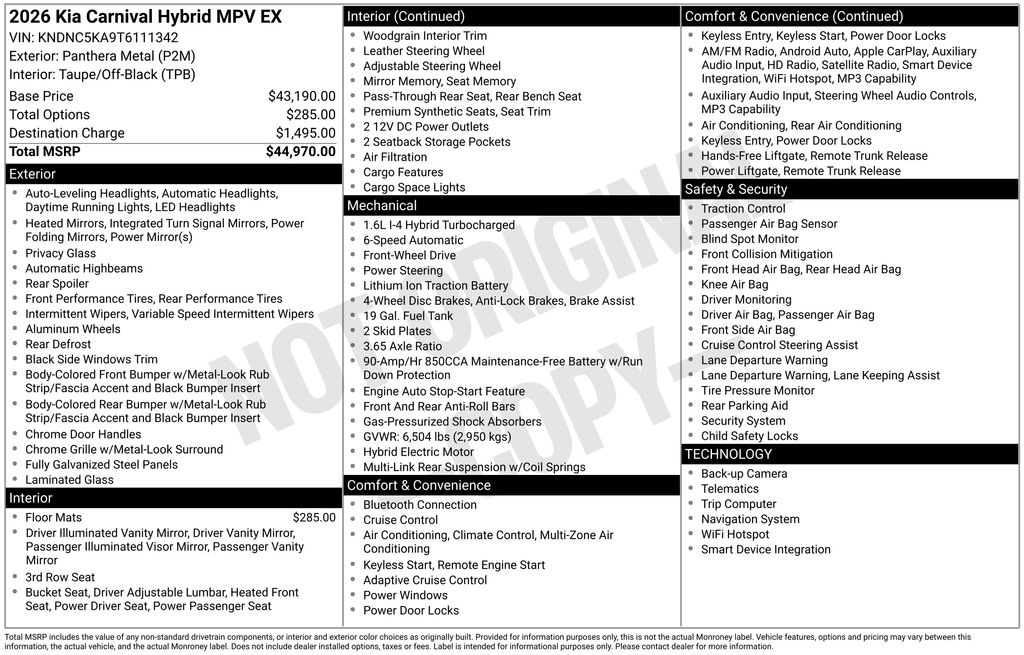Panthera Metal 2026 Kia Carnival Hybrid EX 4D Passenger Van FWD 6-Speed Automatic 1.6L I4 DGI Hybrid Turbocharged DOHC 16V LEV3-SULEV30 34/31 City/Highway MPG Price includes: $1000 - KFA Dealer Choice Program: $1000 discount and 5.25% APR for 36 months. $30.08 per $1000 financed. Available to well qualified buyers who finance through Kia Finance America. 506. Exp. 01/02/2026 $500 - Military Program. Exp. 01/02/2026