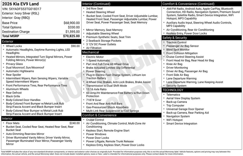 Ivory Silver 2026 Kia EV9 Land 4D Sport Utility AWD 1-Speed Automatic Electric Motor Price includes: $10000 - Kia Customer Cash. Exp. 01/02/2026 $500 - Military Program. Exp. 01/02/2026