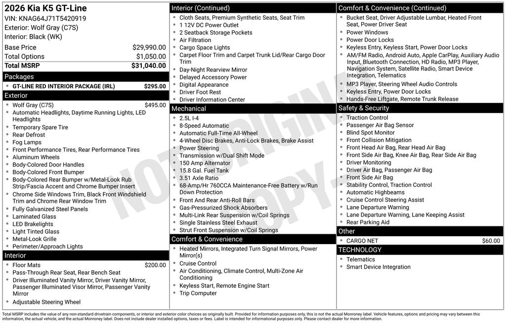Wolf Gray 2026 Kia K5 GT-Line 4D Sedan AWD 8-Speed Automatic I4 24/33 City/Highway MPG Price includes: $1000 - KFA Dealer Choice Program: $1000 discount and 5.50% APR for 36 months. $30.20 per $1000 financed. Available to well qualified buyers who finance through Kia Finance America. 506. Exp. 11/03/2025 $500 - Military Program. Exp. 11/03/2025