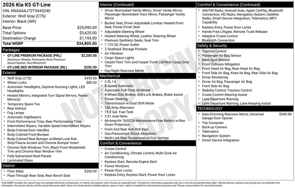 Wolf Gray 2026 Kia K5 GT-Line 4D Sedan AWD 8-Speed Automatic I4 24/33 City/Highway MPG Price includes: $1000 - KFA Dealer Choice Program: $1000 discount and 5.25% APR for 36 months. $30.08 per $1000 financed. Available to well qualified buyers who finance through Kia Finance America. 506. Exp. 01/02/2026 $500 - Military Program. Exp. 01/02/2026