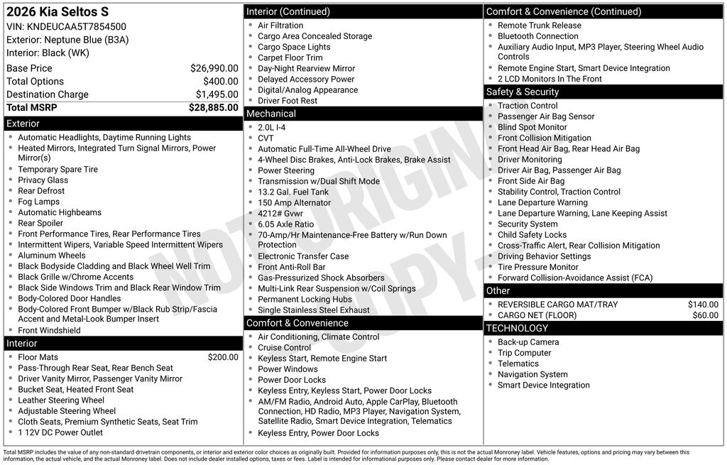 Neptune Blue 2026 Kia Seltos S 4D Sport Utility AWD CVT 2.0L I4 MPI 27/31 City/Highway MPG Price includes: $1000 - KFA Dealer Choice Program: $1000 discount and 5.25% APR for 36 months. $30.08 per $1000 financed. Available to well qualified buyers who finance through Kia Finance America. 506. Exp. 05/04/2026