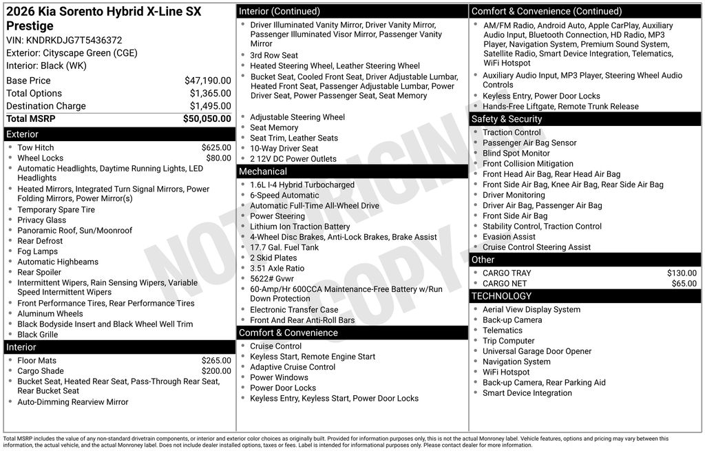 Cityscape Green 2026 Kia Sorento Hybrid X-Line SX Prestige 4D Sport Utility AWD 6-Speed Automatic 1.6L Turbo GDI 4-Cylinder 32/35 City/Highway MPG Price includes: $3000 - KFA Dealer Choice Program: $3000 discount and 5.25% APR for 36 months. $30.08 per $1000 financed. Available to well qualified buyers who finance through Kia Finance America. 506. Exp. 05/04/2026