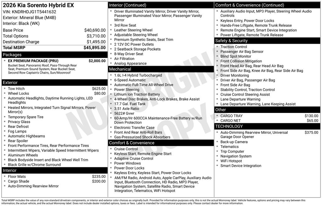 Mineral Blue 2026 Kia Sorento Hybrid EX 4D Sport Utility AWD 6-Speed Automatic 1.6L Turbo GDI 4-Cylinder 32/35 City/Highway MPG Price includes: $3000 - KFA Dealer Choice Program: $3000 discount and 5.25% APR for 36 months. $30.08 per $1000 financed. Available to well qualified buyers who finance through Kia Finance America. 506. Exp. 05/04/2026