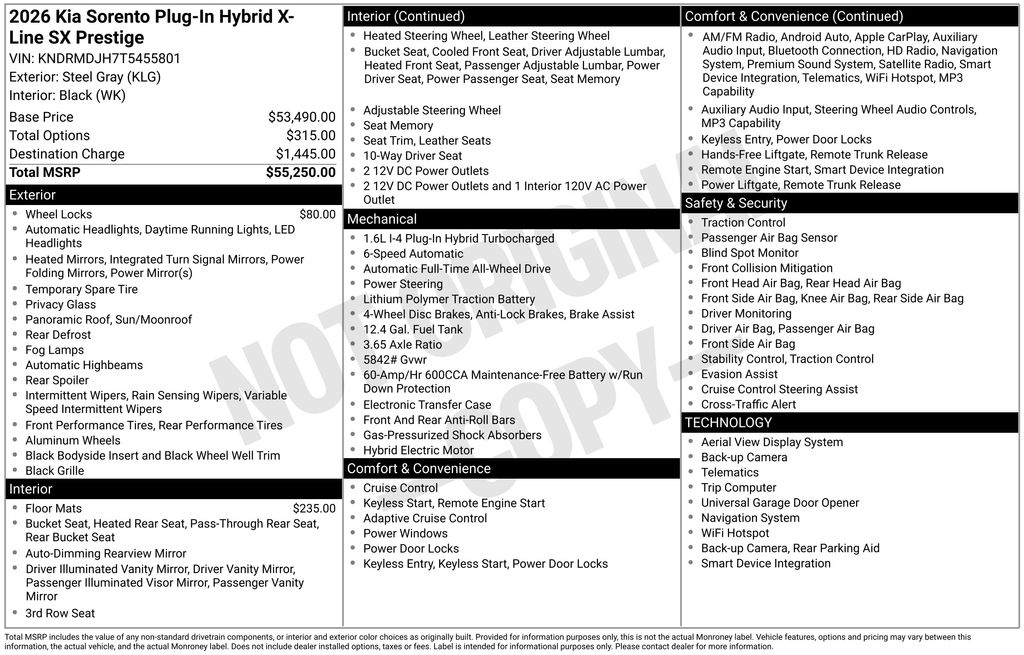 Steel Gray 2026 Kia Sorento Plug-In Hybrid SX Prestige 4D Sport Utility AWD 6-Speed Automatic 1.6L I4 DGI Hybrid Turbocharged DOHC 16V LEV3-SULEV30 Price includes: $2000 - KFA Dealer Choice Program: $2000 discount and 5.25% APR for 36 months. $30.08 per $1000 financed. Available to well qualified buyers who finance through Kia Finance America. 506. Exp. 01/02/2026