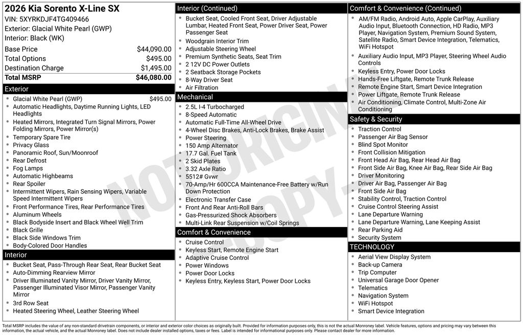 Glacial White Pearl 2026 Kia Sorento X-line SX 4D Sport Utility AWD 8 Speed Dual Clutch 2.5L I4 DGI Turbocharged DOHC 16V LEV3-SULEV30 281hp 20/27 City/Highway MPG Price includes: $3000 - KFA Dealer Choice Program: $3000 discount and 5.25% APR for 36 months. $30.08 per $1000 financed. Available to well qualified buyers who finance through Kia Finance America. 506. Exp. 05/04/2026