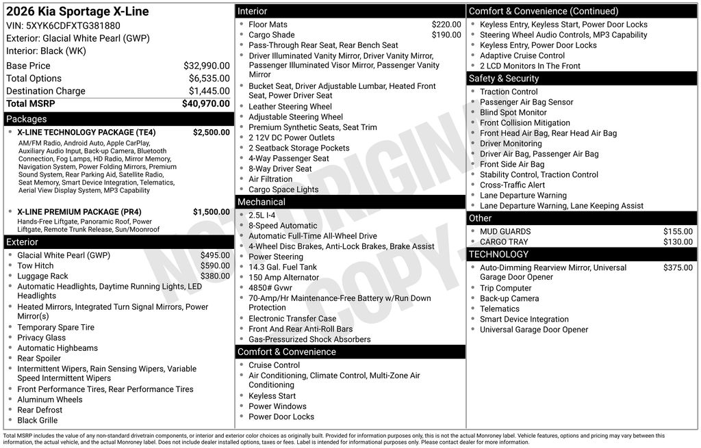 Glacial White Pearl 2026 Kia Sportage X-Line 4D Sport Utility AWD 8-Speed Automatic I4 23/30 City/Highway MPG Price includes: $1500 - KFA Dealer Choice Program: $1500 discount and 5.25% APR for 36 months. $30.08 per $1000 financed. Available to well qualified buyers who finance through Kia Finance America. 506. Exp. 01/02/2026 $500 - Military Program. Exp. 01/02/2026
