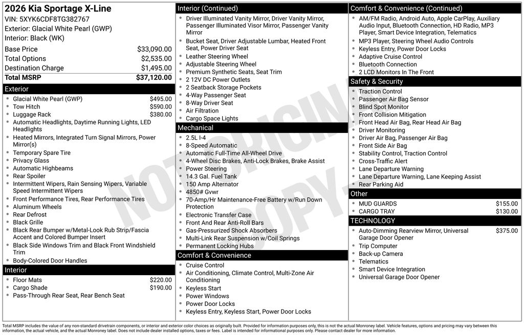 Glacial White Pearl 2026 Kia Sportage X-Line 4D Sport Utility AWD 8-Speed Automatic I4 23/30 City/Highway MPG Price includes: $2000 - KFA Dealer Choice Program: $2000 discount and 5.25% APR for 36 months. $30.08 per $1000 financed. Available to well qualified buyers who finance through Kia Finance America. 506. Exp. 03/31/2026