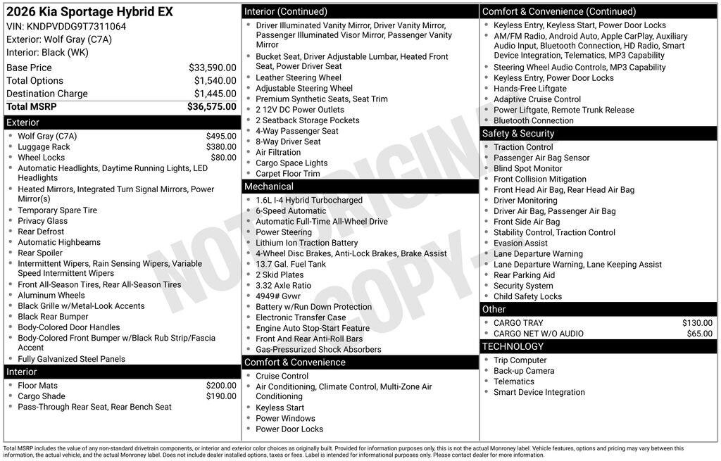 Wolf Gray 2026 Kia Sportage Hybrid EX 4D Sport Utility AWD 6-Speed Automatic 1.6L Turbo GDI 4-Cylinder Price includes: $1000 - KFA Dealer Choice Program: $1000 discount and 5.25% APR for 36 months. $30.08 per $1000 financed. Available to well qualified buyers who finance through Kia Finance America. 506. Exp. 12/01/2025 $500 - Military Program. Exp. 12/01/2025