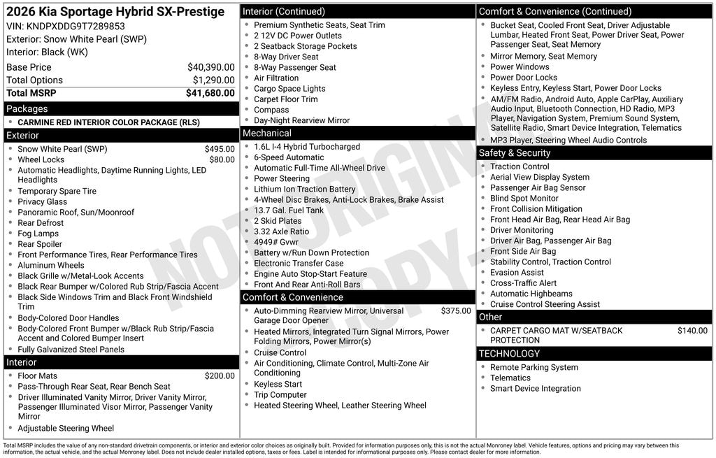 Snow White Pearl 2026 Kia Sportage Hybrid SX-Prestige 4D Sport Utility AWD 6-Speed Automatic 1.6L Turbo GDI 4-Cylinder Price includes: $1000 - KFA Dealer Choice Program: $1000 discount and 5.50% APR for 36 months. $30.20 per $1000 financed. Available to well qualified buyers who finance through Kia Finance America. 506. Exp. 11/03/2025 $500 - Military Program. Exp. 11/03/2025