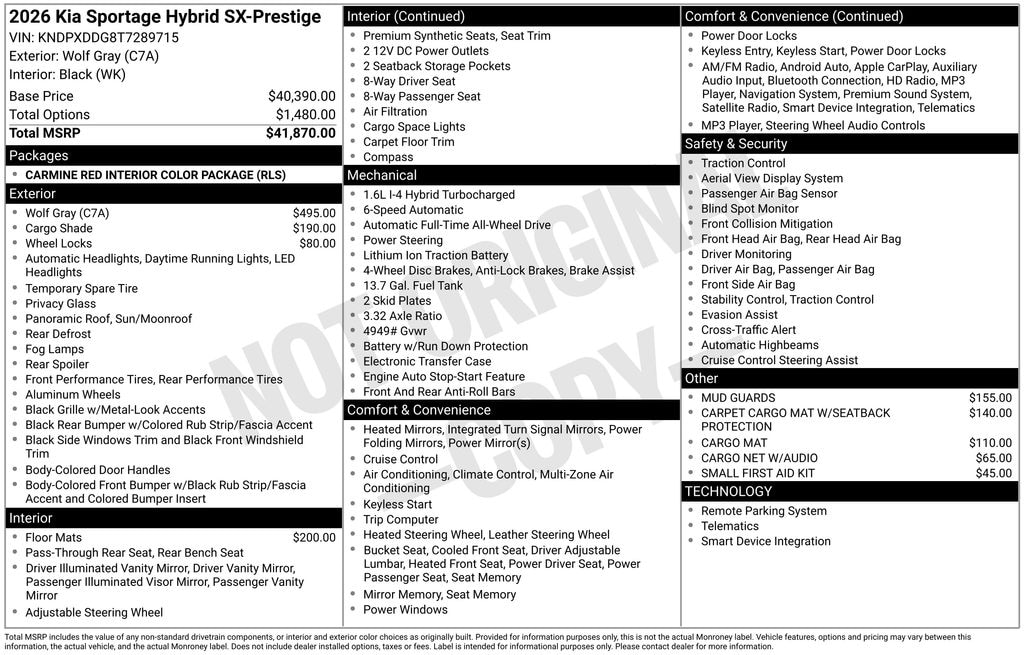 Wolf Gray 2026 Kia Sportage Hybrid SX-Prestige 4D Sport Utility AWD 6-Speed Automatic 1.6L Turbo GDI 4-Cylinder Price includes: $1000 - KFA Dealer Choice Program: $1000 discount and 5.50% APR for 36 months. $30.20 per $1000 financed. Available to well qualified buyers who finance through Kia Finance America. 506. Exp. 11/03/2025 $500 - Military Program. Exp. 11/03/2025