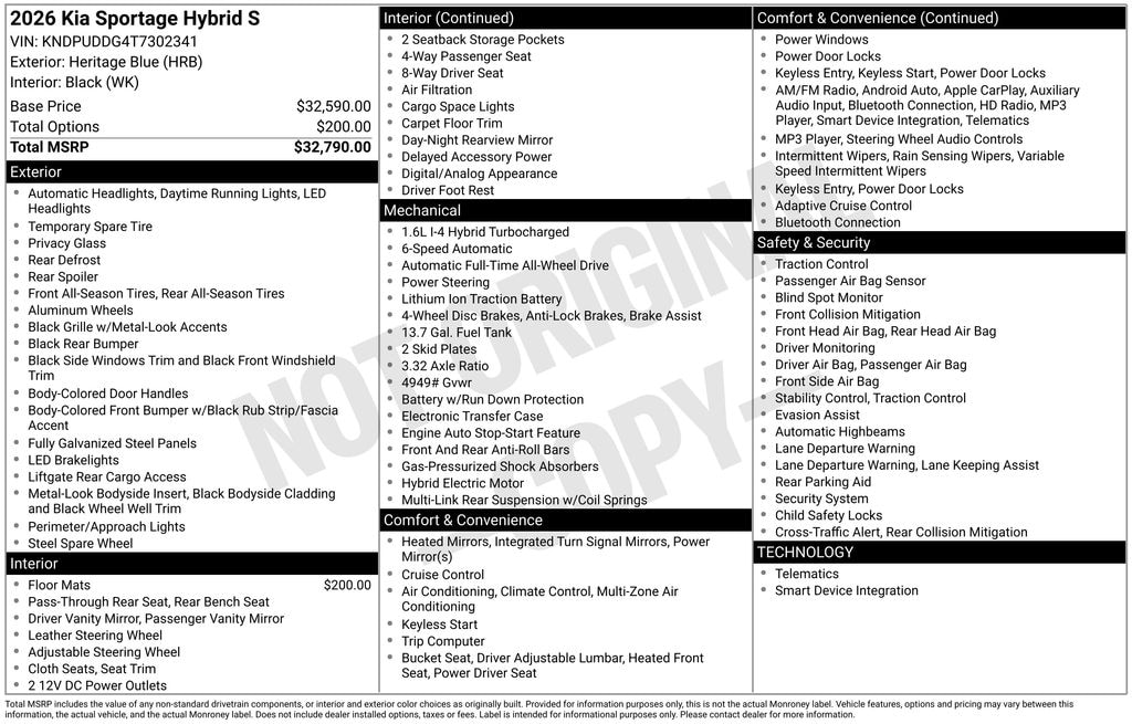 Heritage Blue 2026 Kia Sportage Hybrid 4D Sport Utility AWD 6-Speed Automatic 1.6L Turbo GDI 4-Cylinder Price includes: $1000 - KFA Dealer Choice Program: $1000 discount and 5.50% APR for 36 months. $30.20 per $1000 financed. Available to well qualified buyers who finance through Kia Finance America. 506. Exp. 11/03/2025 $500 - Military Program. Exp. 11/03/2025
