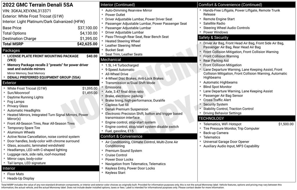 Meticulously engineered for your safety, the Terrain Denali boasts a suite of advanced driver-assistance technologies, including Lane Departure Warning, Automatic Emergency Braking, and Front Pedestrian Braking. You can drive with confidence, knowing your vehicle is equipped to protect you and your loved ones.
