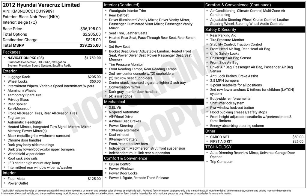 Discover the ultimate in luxury and capability with this stunning 2012 Hyundai Veracruz Limited. This exceptional SUV boasts a powerful 3.8L V6 engine paired with a smooth-shifting 6-speed automatic transmission, delivering the perfect balance of performance and efficiency. Equipped with an advanced all-wheel-drive system, the Veracruz Limited ensures confident handling in any driving condition.