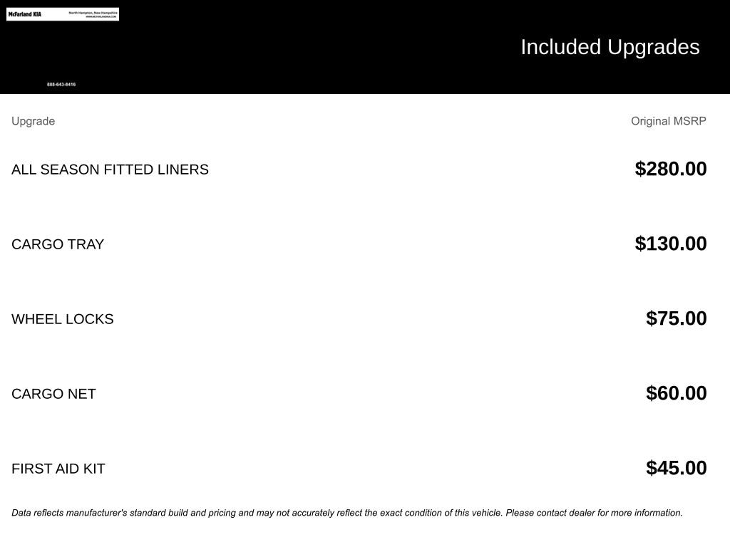 If this vehicle doesn't meet all YOUR criteria, reach out to the Sales Department to speak with a pre-owned specialist to discuss all YOUR transportation needs! With access to hundreds of quality pre-owned vehicles, we can find the perfect car for YOU! Get the best bang for YOUR buck at McFarland Kia! We can be reached at 603-758-3180, or visit our showroom located at 137 Lafayette Rd. North Hampton, NH 03862. We look forward to putting the right vehicle in YOUR driveway!