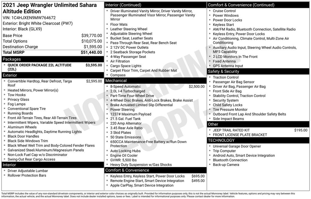 Whether you're conquering the trails or navigating the city streets, this 2021 Jeep Wrangler Unlimited Sahara Altitude is the ultimate expression of rugged capability and refined sophistication. Experience the freedom and confidence that only a Jeep can deliver. Visit our showroom today and discover the unparalleled capabilities of this exceptional Wrangler.