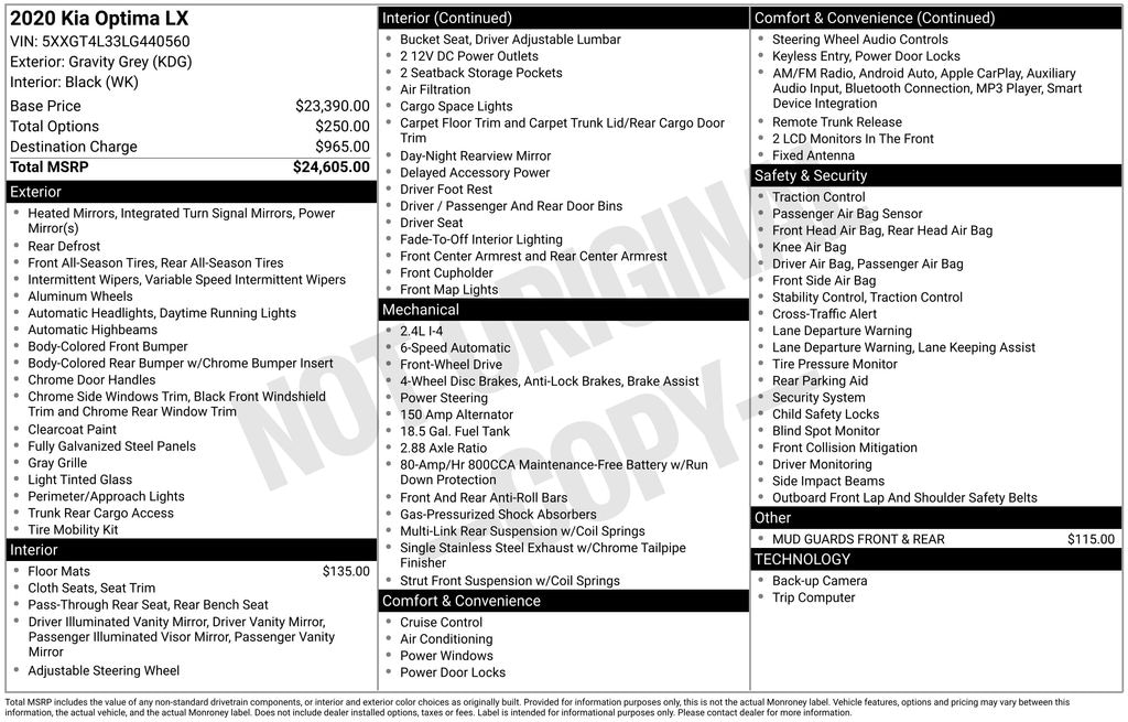 Gravity Gray 2020 Kia Optima LX 4D Sedan FWD 6-Speed Automatic with Sportmatic 2.4L I4 DGI DOHC 24/32 City/Highway MPG