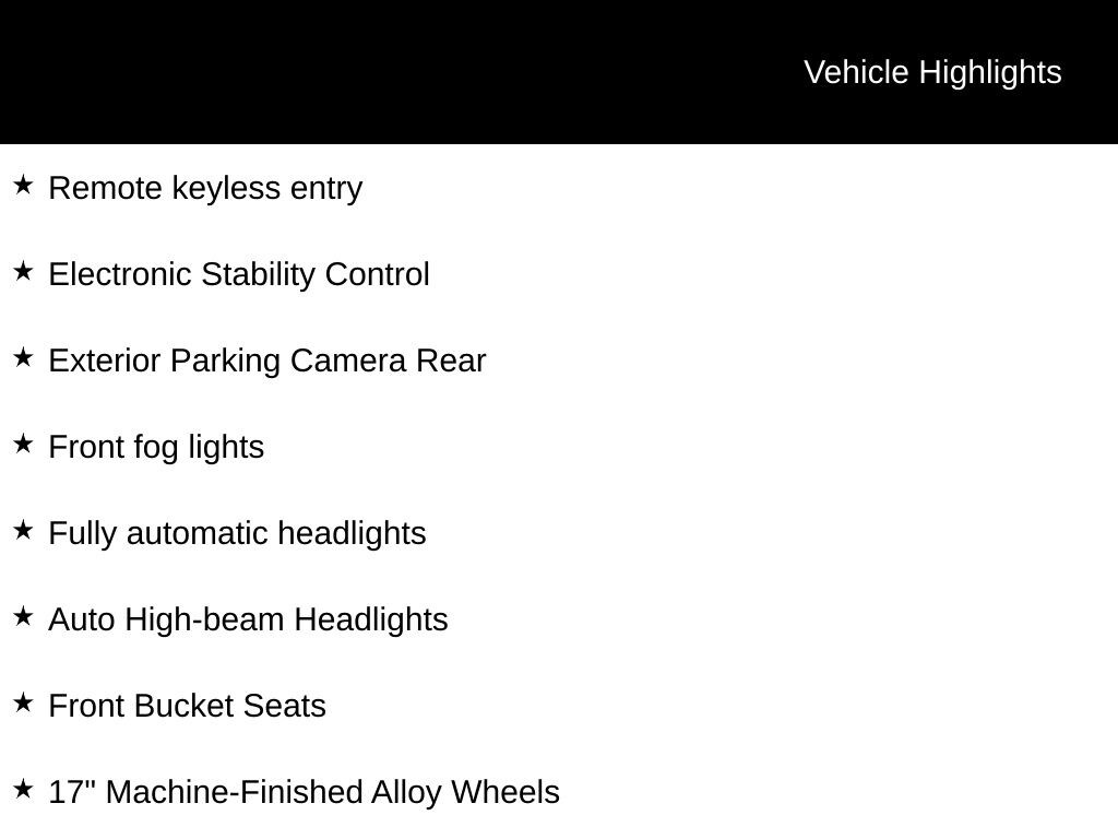 17" Machine-Finished Alloy Wheels, Auto High-beam Headlights, Electronic Stability Control, Exterior Parking Camera Rear, Front Bucket Seats, Front fog lights, Fully automatic headlights, Remote keyless entry.