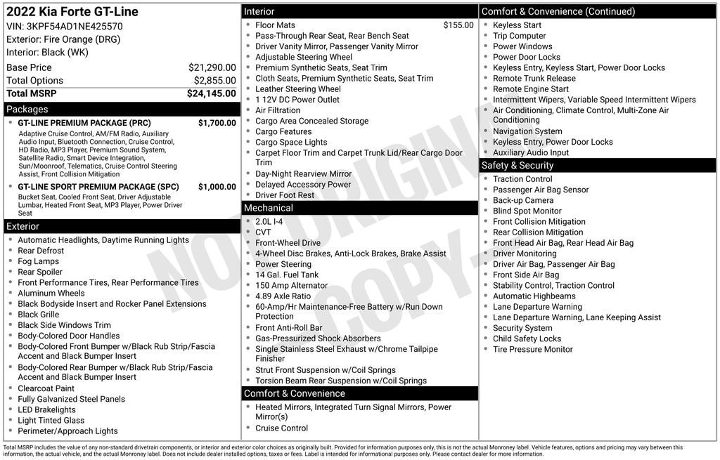 Fire Orange 2022 Kia Forte GT-Line 4D Sedan FWD CVT 2.0L 4-Cylinder MPI 29/39 City/Highway MPG