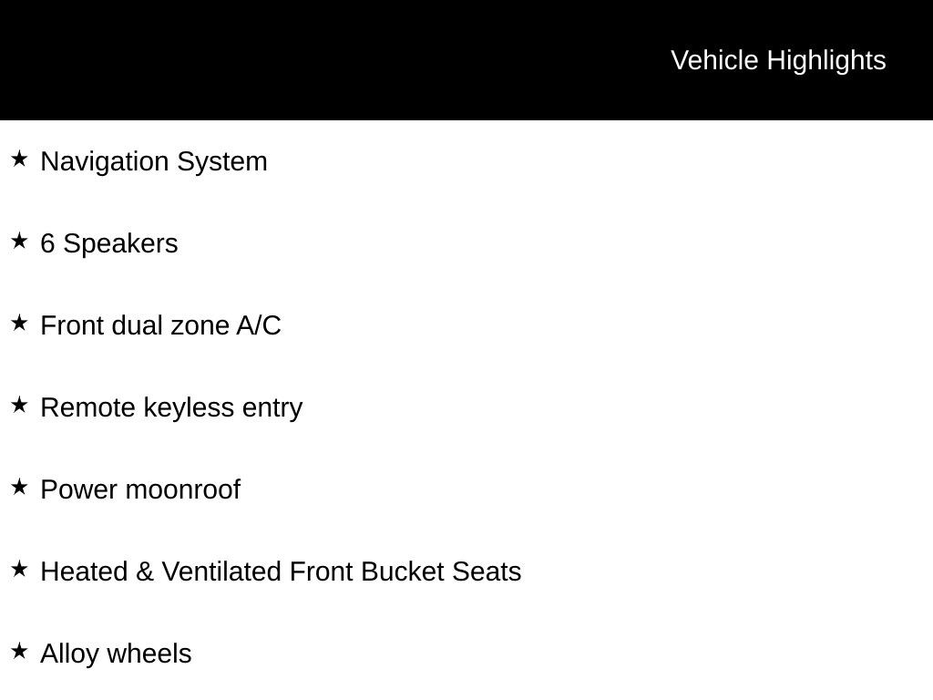 6 Speakers, Alloy wheels, Front dual zone A/C, Heated & Ventilated Front Bucket Seats, Navigation System, Power moonroof, Remote keyless entry.