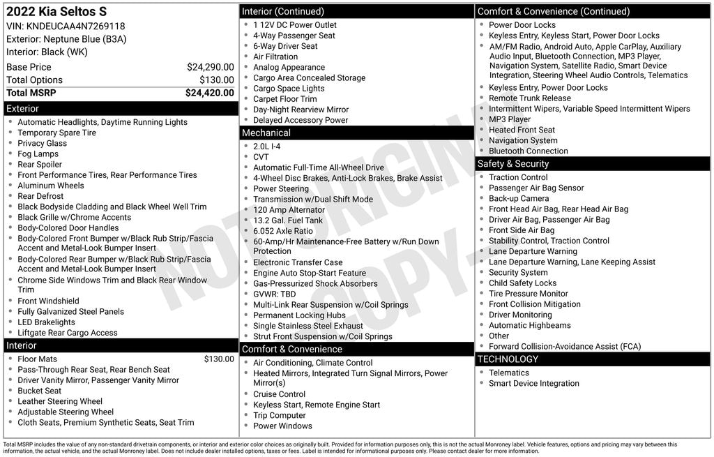 Neptune Blue 2022 Kia Seltos S 4D Sport Utility AWD CVT 2.0L I4 MPI 27/31 City/Highway MPG