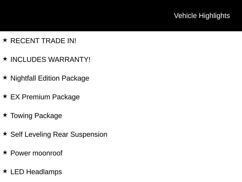 RECENT TRADE IN!, INCLUDES WARRANTY!, 20" x 7.5" Machined Alloy Wheels, 2nd Row Captain Chairs, Black Finish Radiator Grille, EX Premium Package, Exclusive Black Headlight Bezels, Front & Rear Gloss Black Finish Bumper Skid Plates, Gloss Black Finish Exterior Emblems, Gloss Black Finish Front & Rear Door Garnish, Gloss Black Finish Roof Rails, LED Headlamps, Nightfall Edition Package, Power moonroof, Satin Chrome Roof Rails, Self Leveling Rear Suspension, Tow Hitch w/Harness (TOF), Towing Package, Wheels: 20" x 7.5" Exclusive Black Alloy.