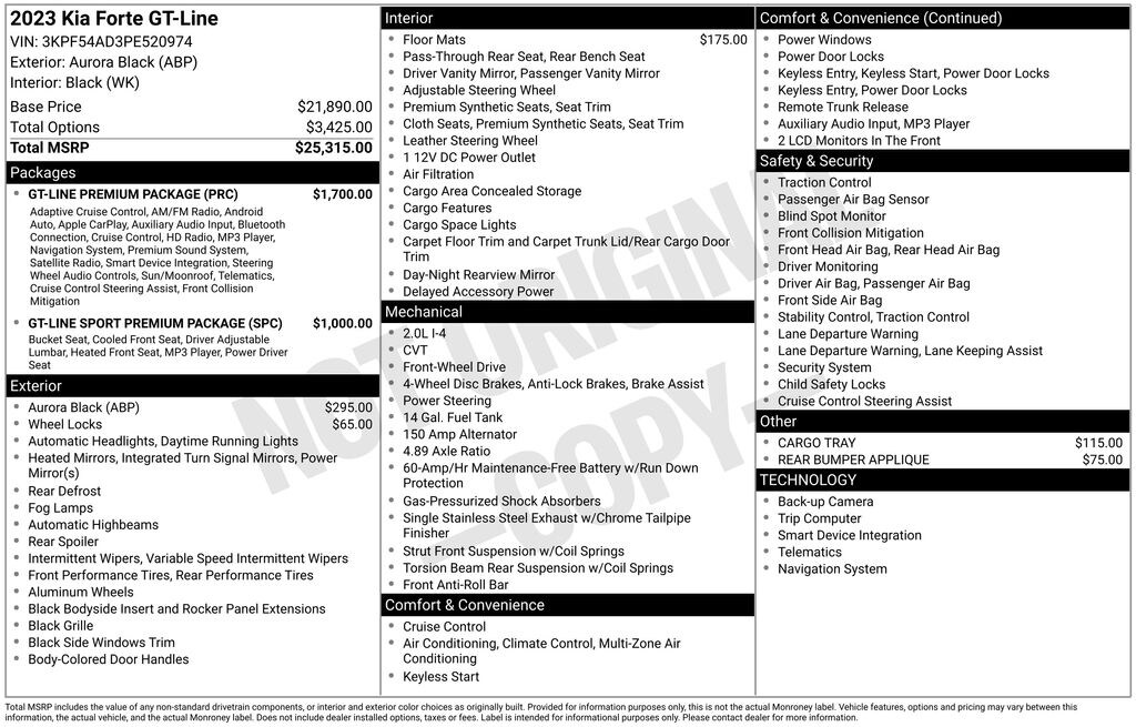 Aurora Black Pearl 2023 Kia Forte GT-Line Sport Premium 4D Sedan FWD CVT 2.0L I4 MPI 28/39 City/Highway MPG
