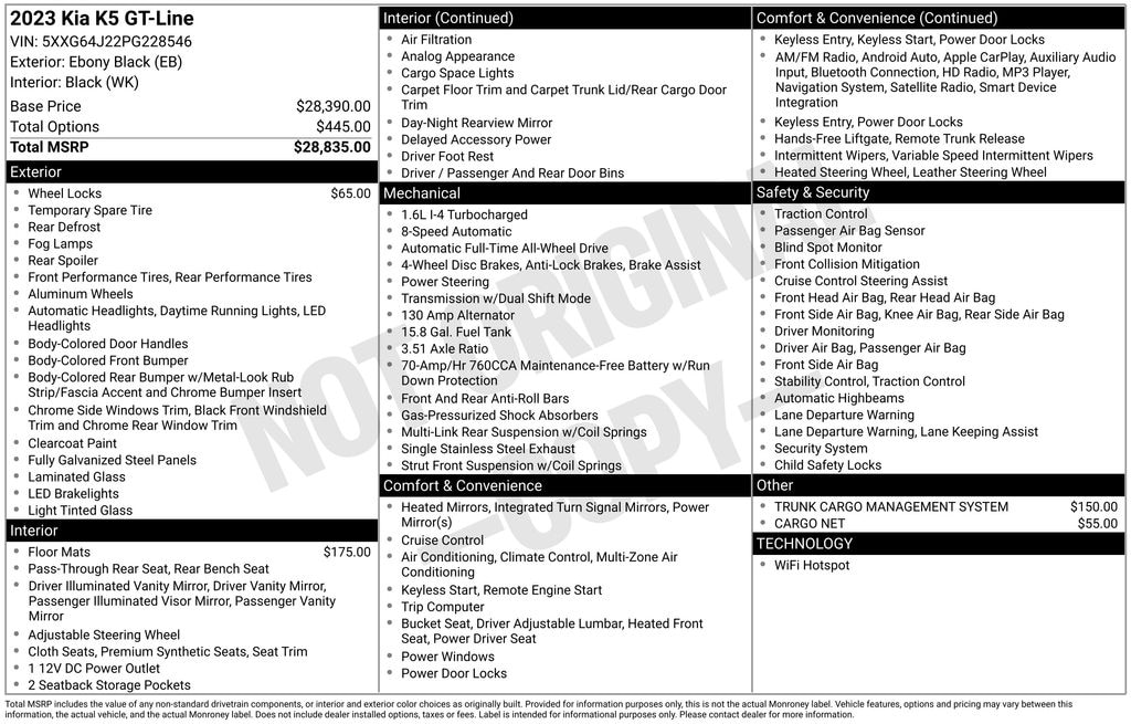 Ebony Black 2023 Kia K5 GT-Line 4D Sedan AWD 8-Speed Automatic 1.6L I4 DGI Turbocharged DOHC 16V LEV3-ULEV70 180hp 25/33 City/Highway MPG