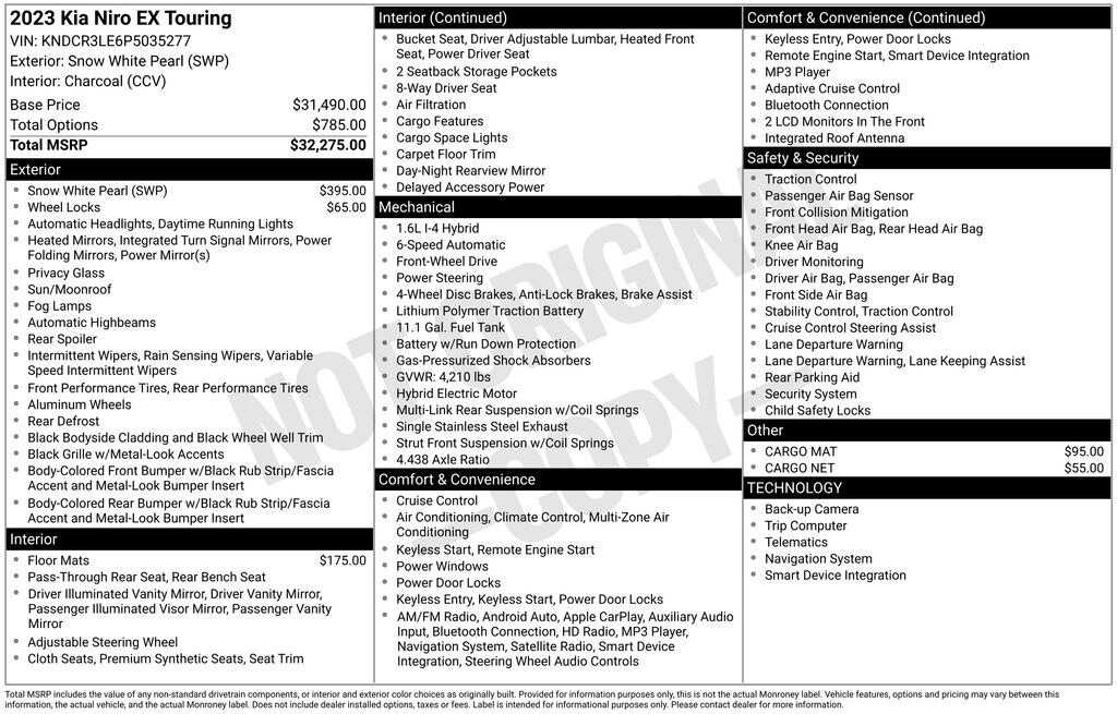 Snow White Pearl 2023 Kia Niro EX Touring 4D Sport Utility FWD 6-Speed Automatic 1.6L I4 DGI Hybrid DOHC 16V LEV3-SULEV30 53/45 City/Highway MPG