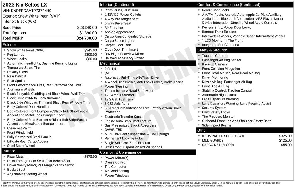 Snow White Pearl 2023 Kia Seltos LX 4D Sport Utility AWD CVT 2.0L I4 MPI 27/31 City/Highway MPG