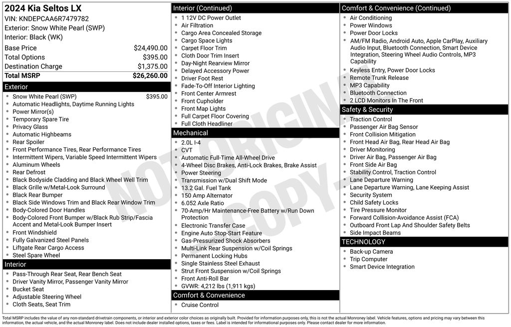 Snow White Pearl 2024 Kia Seltos LX 4D Sport Utility AWD CVT 2.0L I4 MPI 27/31 City/Highway MPG