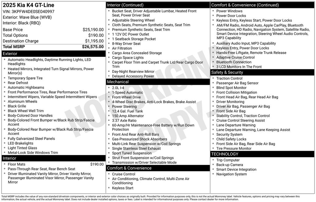 Alluring and practical, the 2025 Kia K4 GT-Line is the perfect companion for the discerning driver who seeks a vehicle that seamlessly blends style, performance, and cutting-edge technology. Experience the exceptional value and refined driving dynamics of this exceptional sedan. Visit our showroom today to take the K4 GT-Line for a test drive and discover why it's the perfect choice for your next vehicle.