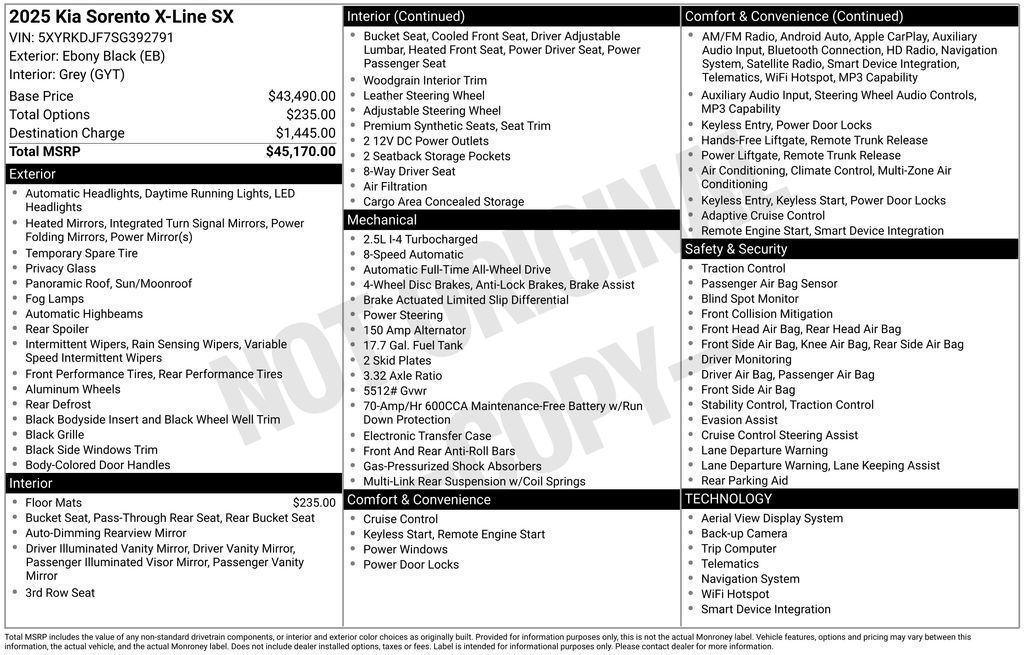 Elevate your driving experience with the 2025 Kia Sorento X-Line SX. This exceptional SUV offers the perfect blend of performance, efficiency, and cutting-edge technology, all wrapped in a stunning, bold design. Visit our showroom today to take this remarkable vehicle for a test drive and discover the future of SUV driving.