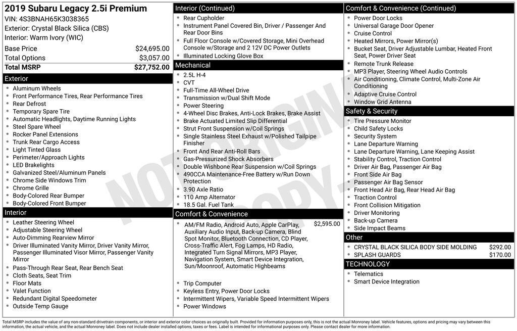 Crystal Black Silica 2019 Subaru Legacy 2.5i Premium 4D Sedan AWD CVT Lineartronic 2.5L 4-Cylinder DOHC 16V 25/34 City/Highway MPG