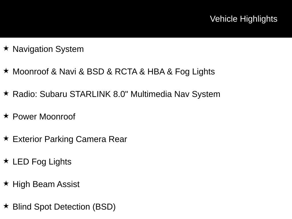 Blind Spot Detection (BSD), Exterior Parking Camera Rear, Heated front seats, High Beam Assist, LED Fog Lights, Moonroof & Navi & BSD & RCTA & HBA & Fog Lights, Navigation System, Power Moonroof, Radio: Subaru STARLINK 8.0" Multimedia Nav System, Rear Cross Traffic Alert (RCTA).