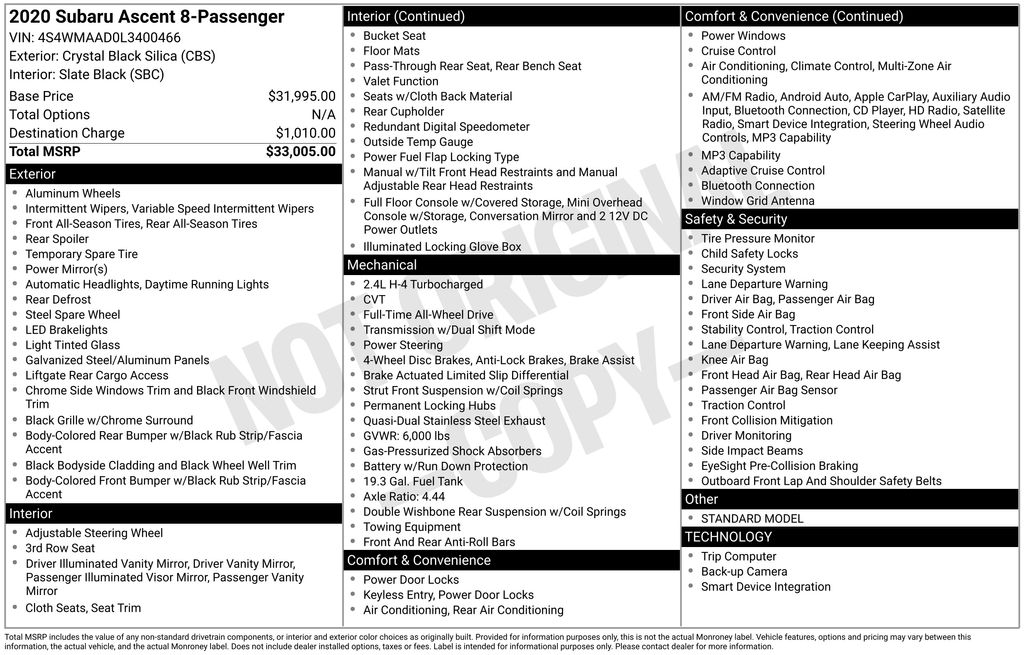 Discover the perfect blend of capability, comfort, and convenience with this 2020 Subaru Ascent Base. This versatile SUV is ready to elevate your driving experience and accommodate your every need.
